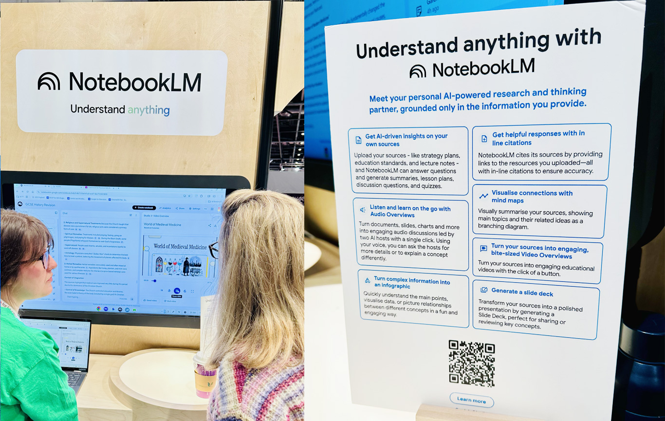 From a higher education perspective, the standout innovation was a relatively new product: NotebookLM. This powerful tool positions itself as a research and thinking partner, grounded in information you trust and built on the latest Gemini models. What sets NotebookLM apart is its ability to work directly with your own materials — your research documents, PDFs, presentations, and even videos — rather than relying on generic data sources.